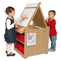 My mom got this for my 2 year old as a Hanukkah gift.My daughter LOVES it.I love that I can put the paint on the shelves to store them and the chalkboard hides it so that she can't get into it, but I can still have it right there with the easel where she will use it.I love that she can use the chalk board while the easel is down (so it is a flat topped table) and with paper on the other side of the easel there is paper so she can color with her crayons on the top of the table while it is down.But when it is raised up it is a big girl easel that she can easily reach but she will certainly be able to grow with this.She has had a lot of fun the last few days drawing and coloring all about.I love that she can pull out her own crayons and chalk from the shelves underneath (opposite side from chalk board so they are exposed all the time) so she can choose to color on her own, as well as being able to use it to teach her the importance of putting things away when you are done.