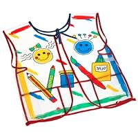 Wish this had sleeves, the plastic is pretty hard or thick not sure if that is good or bad, probably good for durability or bad movement restriction.Its pretty big too big for my 2 year old i use clothes pins or clips to keep it on.Keeps paint off clothes thats always good but could fit better.