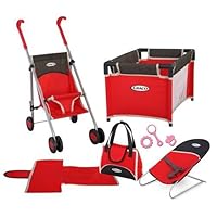 I purchased the large Graco doll stroller for my granddaughter and loved it so much I decided to get the matching set. This is not quite as sturdy as the big stroller, but still nice and she has gotten lots of use out of all. The bouncy seat should be better designed, the cover slips off whenever you pick it up.