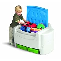 Nearly 2 years later this has held up brilliantly. When it starts to look yucky I grab a magic eraser or some clorox wipes and it looks brand new again. We now have 2 kids and plan to get another as soon as we carve out some space. One thing that I'm not crazy about is the 2 green drawers at the bottom. They do a fantastic job of holding the little toys that get lost in the big area but our oldest likes to pull them out and not put them back. They do not have tracks for them to slide into place and she can easily do it on her own, she just doesn't like to reach near dark areas. It doesn't change my opinion of the toybox at all, I still give it 5 stars, just something that I thought people might want to consider.After an irrepressible nesting impulse overtook me at only five months pregnant with our second baby, I decided to relieve the tension through a massive re-org of my two year-old daughter's toys.We use the huge main storage compartment for her stuffed "friends" and the two green bins for her two sets of blocks.It only took her a few minutes to master opening and closing the top without smashing her fingers, and even when the lid lands on a finger it doesn't seem to distress her.I love that she can easily lift the lid and pull out the green drawers herself; it leaves her no excuse not to help cleanup.When she recently started climbing inside the toy box, we learned why the hinges of the blue door rely on gravity; she easily pushes the whole top off with her head, leg, or whatever body part first attempts to escape.I also like the rounded edges which keep both of us bruise free when we inevitably run into the thing multiple times a day.The standard "Little Tikes" plastic is both durable and easy to clean.Since it's not the smallest toy chest on the block, make sure you check the measurements against your available space.Also, since the colors are just as vibrant in person as they appear online make sure you're comfortable with the youthful aesthetic it brings to a room.