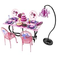 This Barbie furniture set is very pretty and a lot of fun to play with, it includes an expandable table, 4 chairs and a lamp and comes with a lot of accessories plates, glasses, food, etc. The table and the chairs are sturdy, but the lamp is very flimsy as are some of the smaller accessories they constantly fall off the table which can be really frustrating at times. I like that the chairs are just the right size for Barbie dolls and that Barbies can "sit" without falling off...however, Barbies' legs don't fit very well under the table, so if your/your child's (children's) Barbie dolls have bendable legs it might be a good idea to bend them (the legs, that is). If the legs don't bend, you might want to put a chair with a Barbie in it a bit further from the table, especially if you are trying to place two dolls across from one another. Other than that, I think it's a great toy. My 5-yr old loves it and plays with it all the time she has a lot of fun rearranging plates, glasses, cakes, etc. It also turned out to be a lot more durable than I expected.