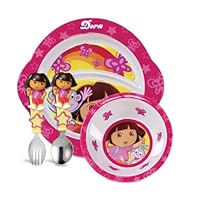 I purchased this item because we already had the Sesame Street Munchkin dining set (which is fantastic). I was going to just buy another one of those, but I saw this one and decided to get it because it was different. I figured that it would be the same exact thing with just different characters on it. It is not the same. The Sesame Street set has held up for a longer period of time with no issues. This set, however, has not. My main issue is with the plate. I put it in the dishwasher (top rack as indicated), and it came out with the plastic rippled and coming off. It gets worse with each wash. In addition, the spoon and fork are bigger and clunkier than the Sesame Street set. My advice is not to buy this and get the Sesame Street set instead.Read Best Reviews of Munchkin Dora The Explorer Toddler Dining Set Here
