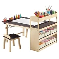 This artist table is wonderful!! My kids love the chairs, and all the shelves and cubby spacing for all their pencils, crayons, etc.My daughter loves coming home from school and going straight to her desk to color.The only negative would be to be careful to inspect the desk when it arrives because ours came with the cardboard box beaten up a little bit but we were lucky and found no damage to the desk pieces when we opened everything and looked.This unit looks just like it's pictured. The stools are small, but my girls don't mind that they're not chairs. It's also a great height for my girls to stand and draw. Having the paper always available is great, because I don't have to constantly replace single sheets. The storage bins are a little flimsy and thin, but they serve their purpose well. We did have a little trouble with assembly because the holes were not properly aligned for a couple screws, but my husband, who is quite handy, was able to make it work. We're definitely pleased with our choice, having searched a long time for the right unit.This table is great quality (except for the storage bins that come with it.) It was easy to put together and looks great... I even put it in my living room the color fits great. I like all of the storage for art supplies and the paper roll for drawing and coloring. Also, this product arrived damaged and the 3rd party seller quickly refunded all money through amazon.don't even bother to look at this made in china pcs. of junk...overpriced , low quality , no even good enough for fire wood